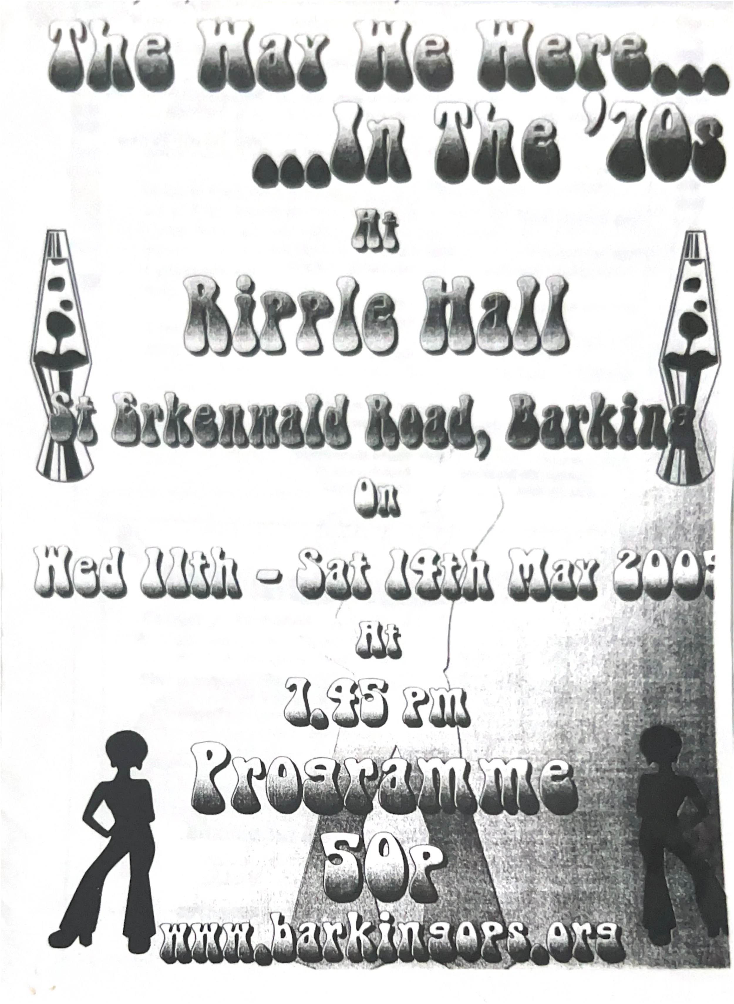 An announcement poster for a ripple hill event at Barking on Wednesday, March 16th, 2005, from 7:45 PM. The poster includes stylized text, two lava lamp illustrations, and silhouettes of a woman and a man. The event features a program costing 50 penc