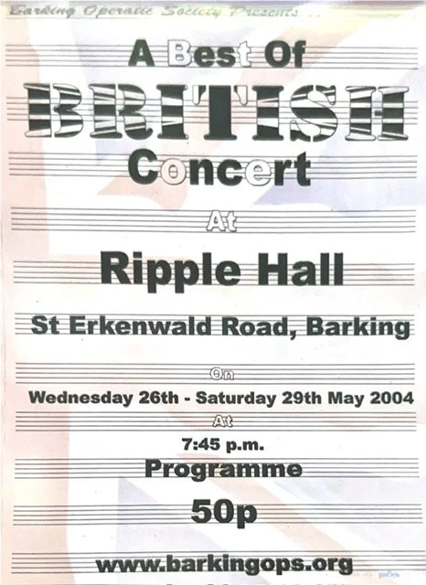 Flyer for a concert titled 'A Best of British Concert' at Ripple Hall, Barking, at Ripple Hall, St Erkenwald Road, Barking, from May 26 to May 29, 2004, starting at 7:45 p.m., with a ticket price of 50 pence, hosted by Barking Operatic Society.