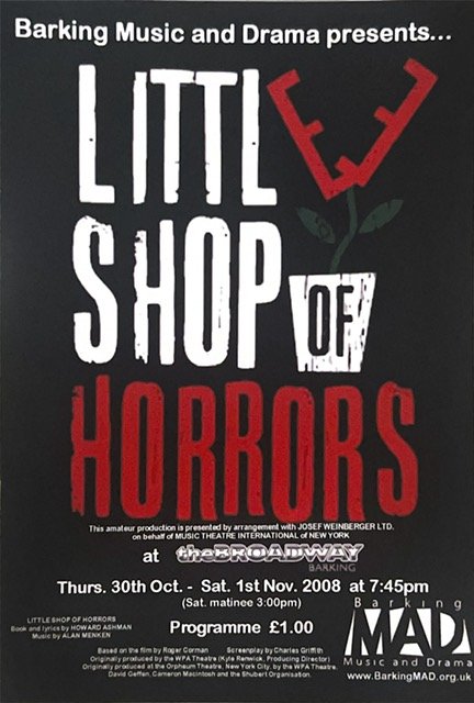 The promotional poster for the play 'Little Shop of Horrors,' produced by Barking Music and Drama, scheduled from October 30th to November 1st, 2008, at the Broadway Theatre with a ticket price of £1.00.