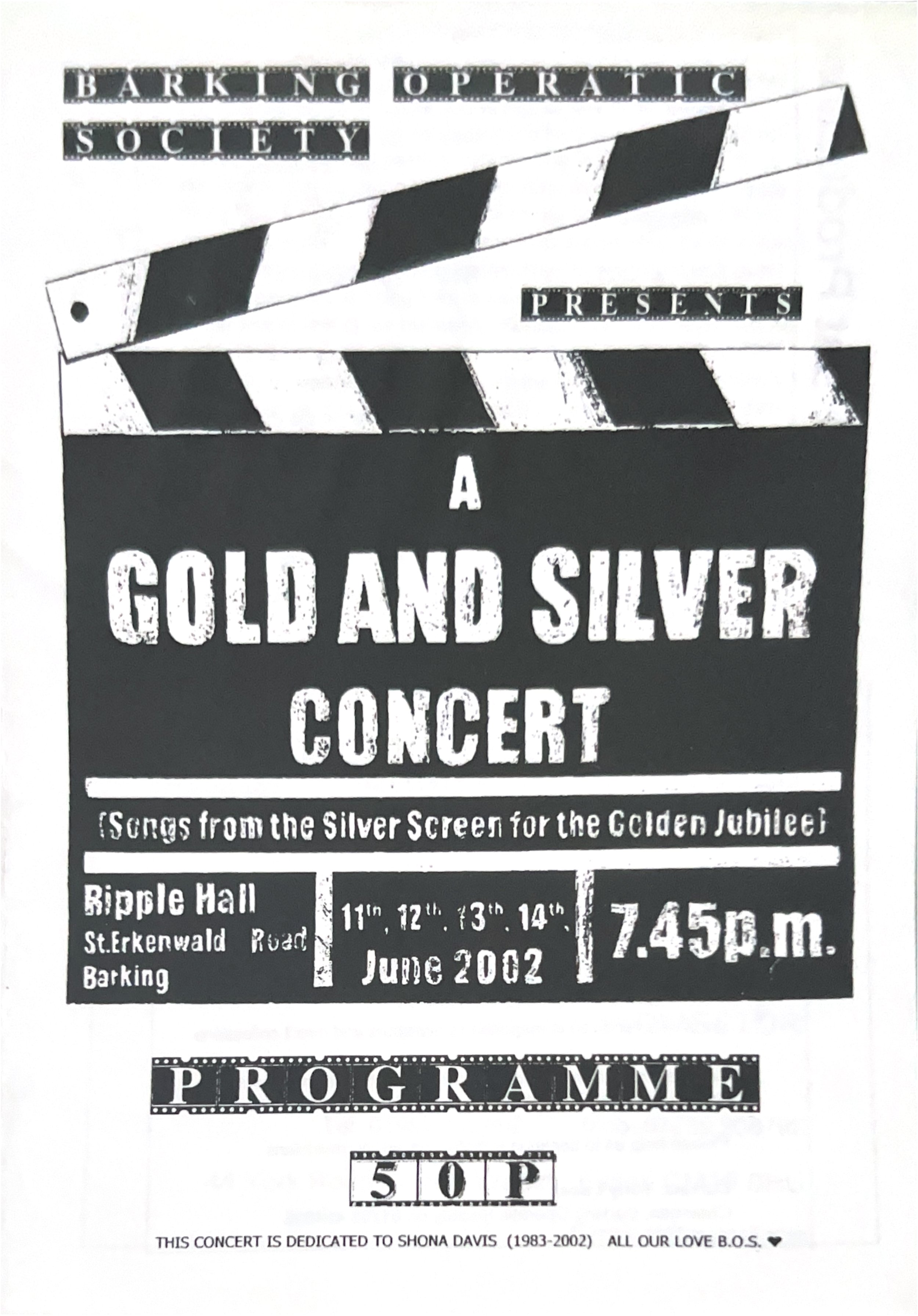 Poster for a concert by Barking Operatic Society titled "A Gold and Silver Concert," featuring songs from the Silver Screen for the Golden Jubilee. Held at Ripple Hall, Barking, on June 11th to 14th, 2002, at 7:45 p.m., with a program cost of 50 penc