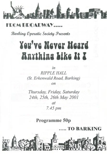 Event flyer for a performance titled "You've Never Heard Anything Like It!" presented by Barking Operatic Society at Ripple Hall on St. Erkenwald Road, Barking, on May 24-26, 2001, at 7:45 pm, with ticket price of 50p. The flyer features silhouettes