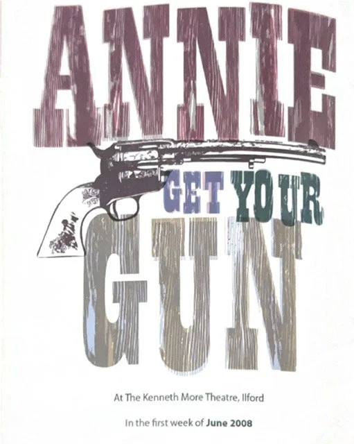 Poster for a play titled "Annie Get Your Gun" at the Kenneth More Theatre in Ilford, during the first week of June 2008, featuring stylized text and a silhouette of a gun.