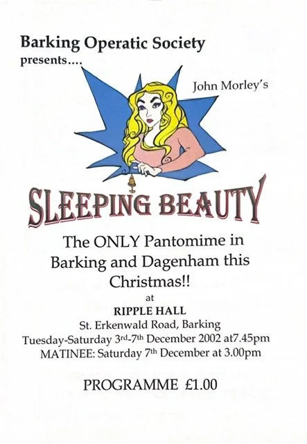 Flyer for a theatrical production of Sleeping Beauty by Barking Operatic Society, featuring a cartoon illustration of a blonde princess with a pink dress, stage details, and event information.