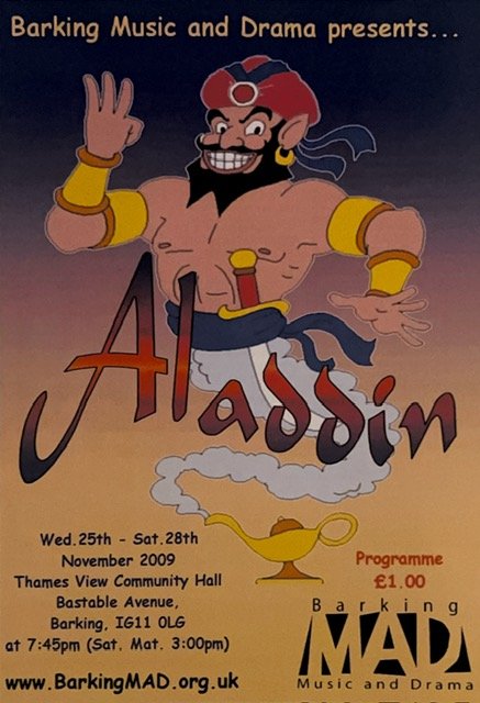 An anime-style cartoon of a muscular, bearded man with red hair and a turban, dressed as Aladdin from Disney, smiling and waving with one hand. The poster advertises a musical and drama production of 'Aladdin' presented by Barking Music and Drama at