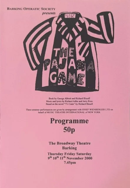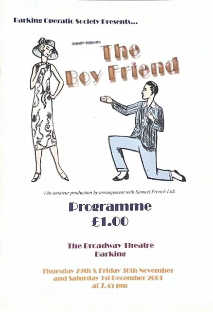 Playbill cover for 'The Boy Friend' presented by Barking Operatic Society, featuring illustrations of a woman in a dress and a man kneeling, with show details and performance dates.