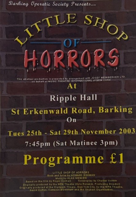 Poster advertising a horror play titled "Little Shop of Horrors" at Ripple Hall on Erkenwald Road, Barking, from November 25th to 29th, 2003, with a program cost of £1, showing performance times at 7:45 pm and a matinee at 3 pm on Saturdays.