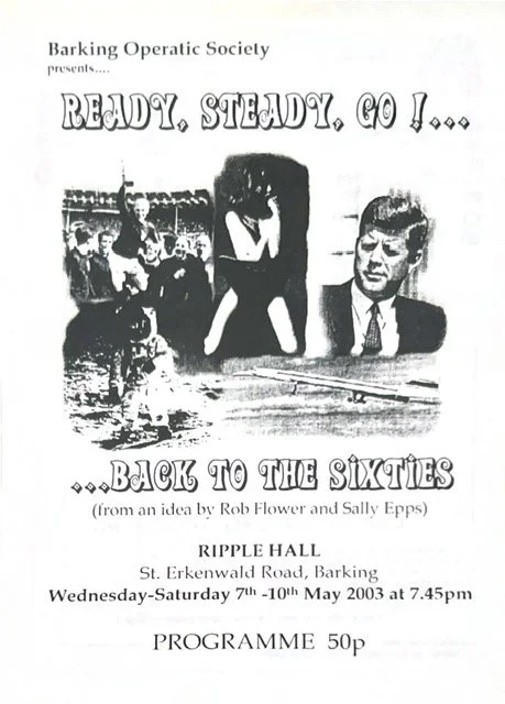 A vintage black and white poster for a 1960s-themed event titled "Ready, Steady, Go! Back to the Sixties," presented by the Barking Operatic Society. It features images of people, a woman covering her face, and a man in a suit, with details about the