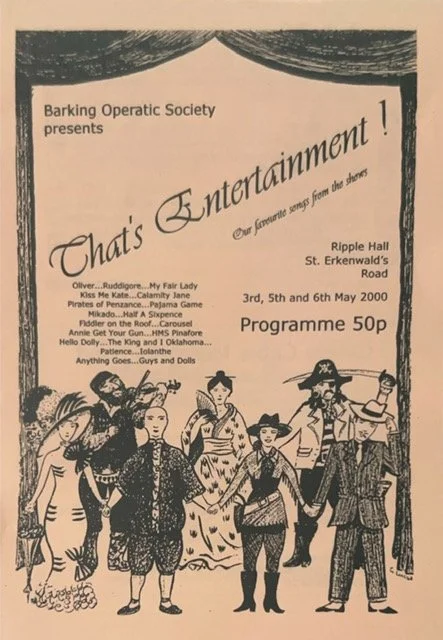 A vintage program for a theatrical entertainment titled 'That's Entertainment' presented by the Barking Operatic Society, held at Ripple Hall, St. Erkenwald's Road, on May 3rd, 5th, and 6th, 2000. The cover features illustrations of characters in per