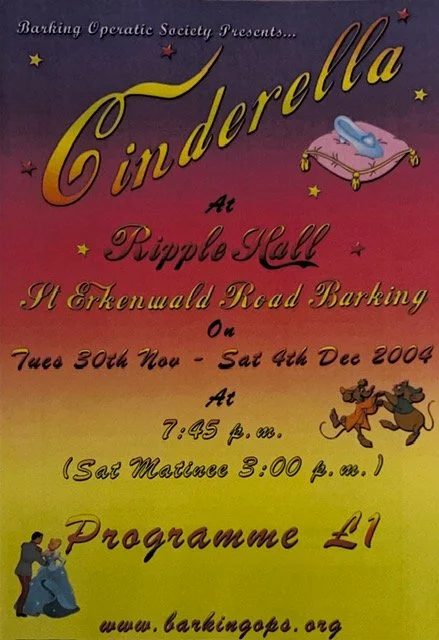 A colorful poster advertising a Cinderella event at Ripple Hall on Erkenwald Road Barking from November 30th to December 4th, 2004, with showtimes at 7:45 pm and matinee at 3:00 pm, and featuring a prince and princess illustration.