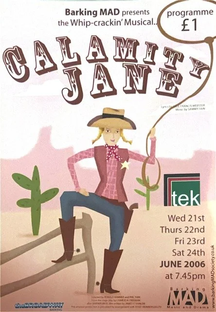 Poster for the musical 'Calamity Jane' presented by Barking MAD, featuring a cartoon illustration of a cowgirl with a hat, pink shirt, and boots, sitting on a fence with a pink background. Shows performance dates: June 21-24, 2006, at 7:45 pm, with t