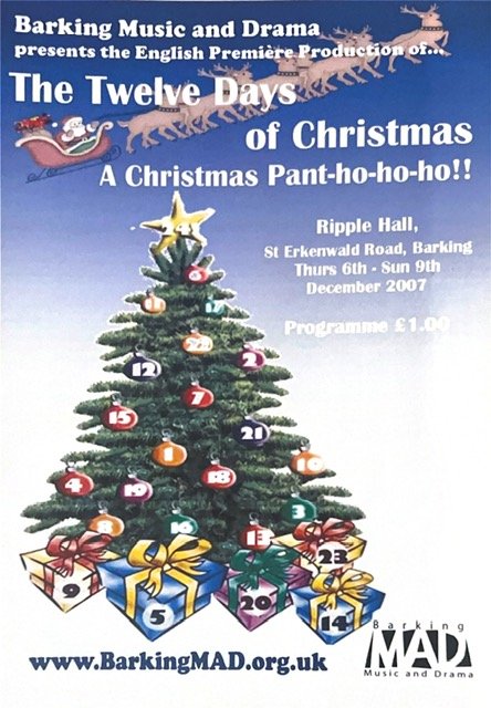 Christmas-themed poster advertising 'The Twelve Days of Christmas' production by Barking Music and Drama in December 2007 at Ripple Hall, with a decorated Christmas tree, presents, and Santa in a sleigh with reindeer.