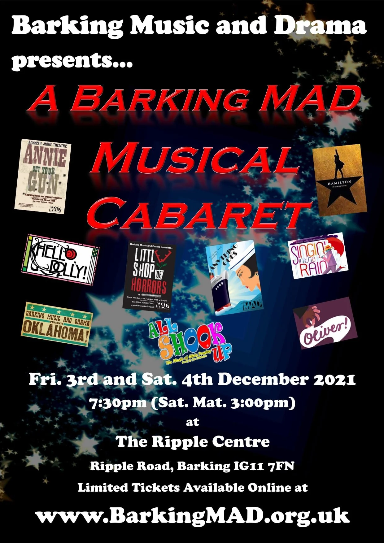 Poster for a musical cabaret titled "A Barking MAD Musical Cabaret" presented by Barking Music and Drama, scheduled for December 3rd and 4th, 2021, at The Ripple Centre in Barking, with showtimes at 7:30 pm and 3 pm, featuring various productions.