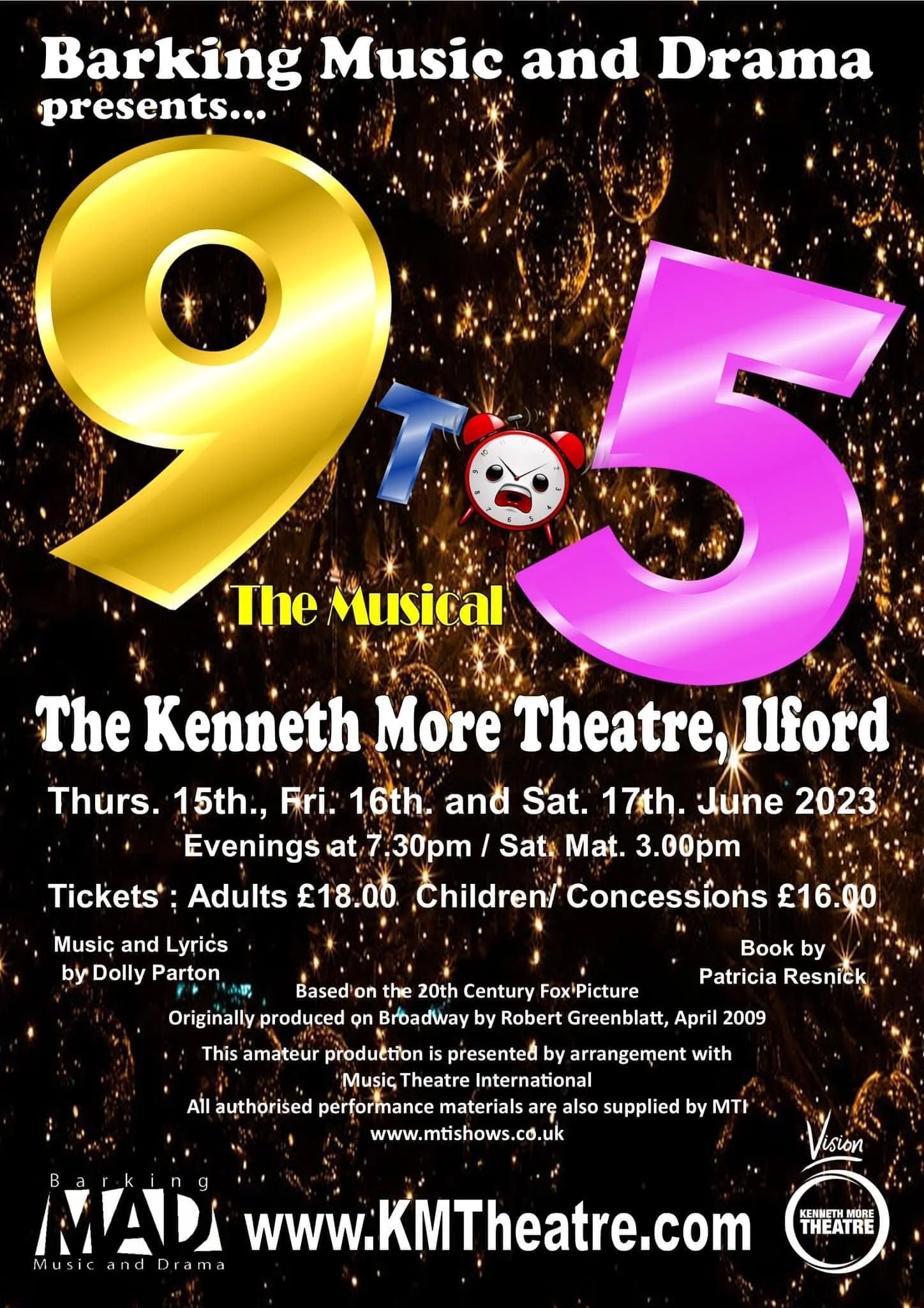 Poster for a musical titled '9 to 5' presented by Barking Music and Drama, featuring colorful large numbers '9' and '5', a small blue 't', a red alarm clock with a face, and details of the performances at The Kenneth More Theatre in Ilford in June 20