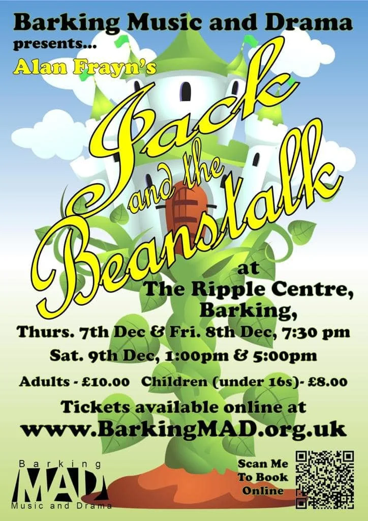 Event poster for Barking Music and Drama presenting Alan Frayn's Jack and the Beanstalk at The Ripple Centre, Barking, featuring dates in December, ticket prices, online booking information, and a QR code.