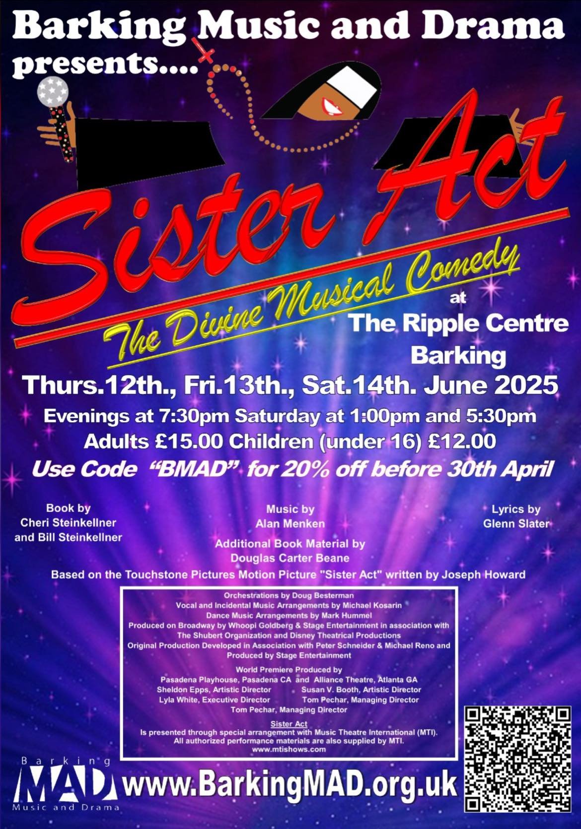 Poster for a musical comedy titled Sister Act, presented by Barking Music and Drama, at The Ripple Centre in Barking on June 12-14, 2025, with evening performances at 7:30 PM and matinees on Saturday at 1:00 PM and 5:30 PM.