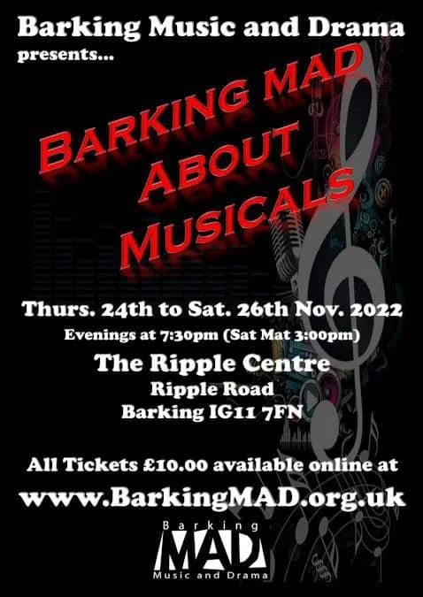 Event poster for Barking MAD about Musicals, taking place from November 24th to 26th, 2022 at The Ripple Centre, Barking. Tickets are £10, available online at barkingMAD.org.uk.