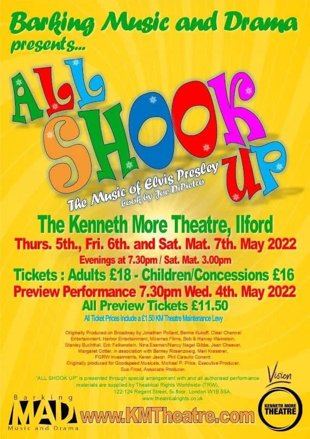 Colorful poster advertising a musical titled 'All Shook Up' at the Kenneth More Theatre in Ilford, featuring performances on May 5-7, 2022, with ticket prices and performance times listed.